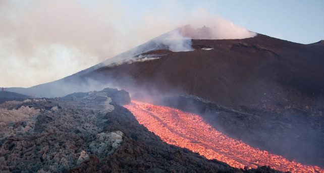 L'emissione lavica forma una piccola colata lavica diretta verso ovest che si sovrappone al campo lavico in raffreddamento.